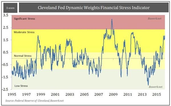 下图反映了1995年至2015年克利夫兰联储动态加权金融压力指示器变化情况。