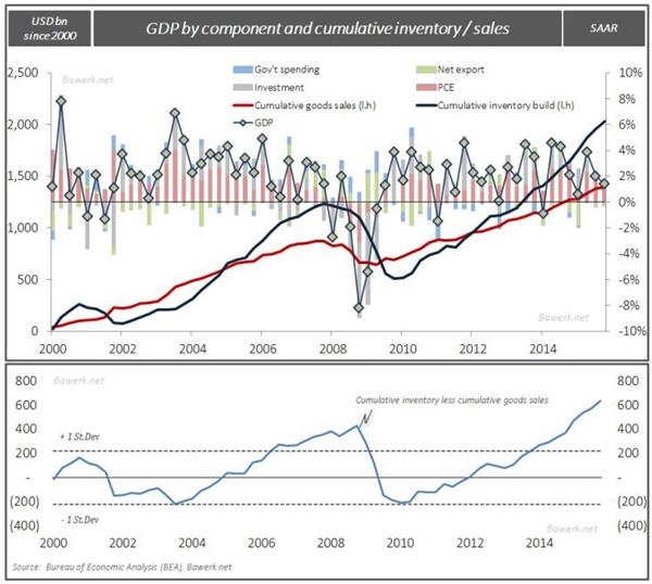 2016年4月28日晚些时候美国经济分析局发布了第一季度国内生产总值预期。亚特兰大联储和纽约联储已经发布了“实时预测”,两份预测都指出年增长率在0.5%至1%之间。然而,库存水平的变化很容易对以上数据造成影响。正如我们的累积库存/销售图显示,销售量和库存之间的绝对差并没有变大。值得一提的是,这些因素总会引起剧烈起伏。当库存清算开始时,我们将看到增长率大幅下滑,之后突然为负。