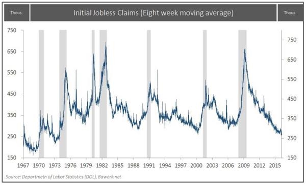 下图反映了1967年至2015年首次申请失业津贴人数变化情况