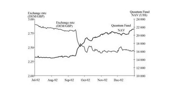 ▲1992年量子基金净值走势和英镑走势对比图
