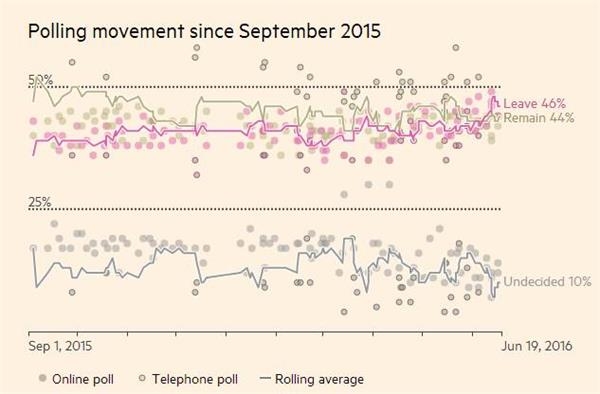 自议员遇袭后,民调走势在近期出现了退欧下降,留欧增长的趋势。