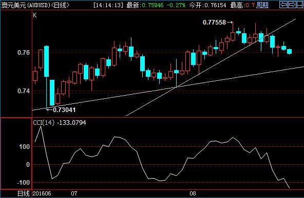 澳元兑美元日线周期上,CCI指标进入超卖区,KD指标也下行临近超卖区,关注可能启动的杀多走势。短线4小时周期上,汇价上冲下降回归通道上沿未果,重回中轨附近。