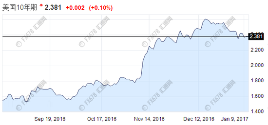 特朗普11月8日胜选后,10年期国债收益率跳涨,12月15日涨至这波高峰2.5967%;7月8日曾创下历史低点1.3579%。目前10年期美债收益率为2.38%。