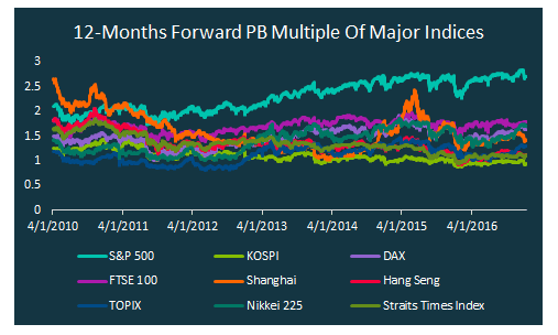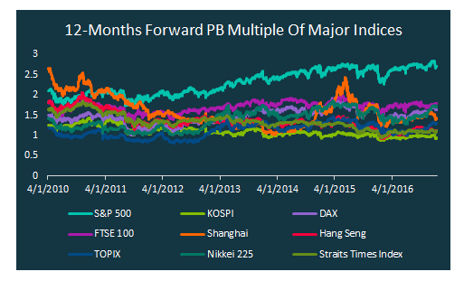 直至今天,按照市盈率(PE)来看,与恒指(红)类似,韩国股市(绿)仍然是世界上估值最低的市场之一,2017年PE大概在10倍左右,而世界上其他的主要市场约在13-19倍左右。