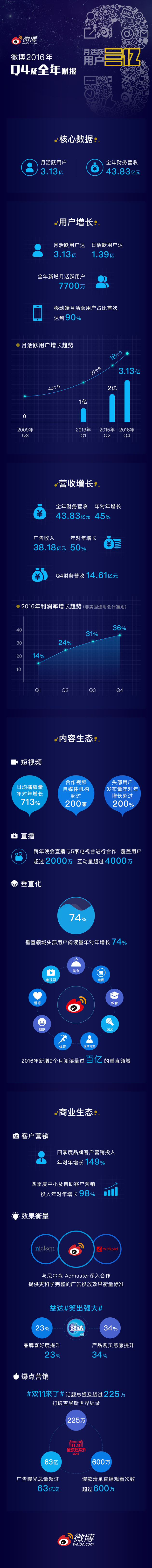 2月23日,微博发布2016年第四季度及全年财报。截至2016年底,微博月活跃用户全年净增长7700万,增至3.13亿,移动端占比达到90%。随着信息流产品的优化、视频的爆发以及垂直化的稳步推进,微博表现出强烈的网络效应,活跃用户继续保持高速增长。