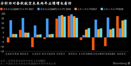 彭博数据显示,分析师们对春秋航空未来增长的乐观程度要高于中美两国同业。彭博汇总的分析师预估中值显示,春秋航空的每股收益在2017与2018财年有望分别增长22.9%和24.5%。 中国国航2017财年的每股收益预估中值为下降9.3%,2018财年上升21.1%。美国航空集团2017财年的每股收益料下降5.3%,2018财年则为增长18.3%。