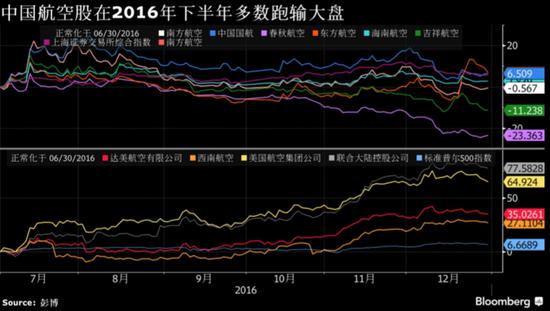 中国航空公司的股市表现却差强人意。2016年下半年,春秋航空大跌24%,吉祥航空下挫11%,南方航空A股下跌0.6%,中国国航A股上涨6.6%,东方航空A股上涨7.8%,海南航空A股上涨2.8%;同期上证综指上涨5.9%。若以全年来看,航空股跑输大盘的程度则更甚。