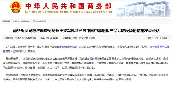 北京时间28日商务部网站消息,欧委会对原产于中国的中厚板产品做出反倾销调查终裁,并决定实施为期5年的反倾销措施,反倾销税率为65.1%-73.7%。商务部贸易救济调查局局长王贺军就此作出回应。