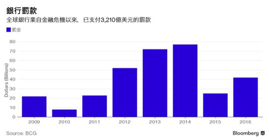 据BCG 周四公布第七年的银行业研究报告,未来几年这个金额势必会增加,因为欧洲和亚洲监管单位急起直追,跟上美国监管机关的脚步。截至目前为止,美国金融业的监管机构开出的罚款最多。数据显示,单单是2016年,银行缴交了420亿美元的罚金,较前一年增加68%。