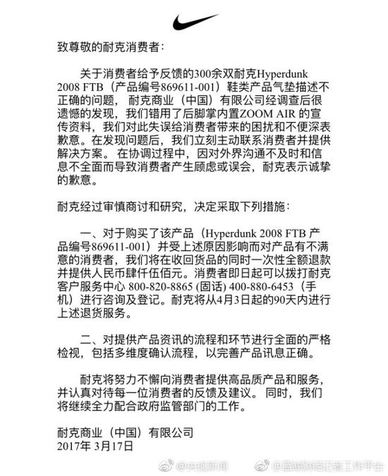 耐克表示,关于消费者反馈的耐克Hyperdunk 2008 FTB鞋类产品气垫描述不正确的问题,经调查后很遗憾的发现,错用了后脚掌内置ZOOM AIR 的宣传资料,对此失误给消费者带来的困扰和不便深表歉意