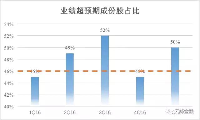 注:除1Q17外,其他四个季度为报告季整体数据;橙线代表长期历史平均数据(46%)