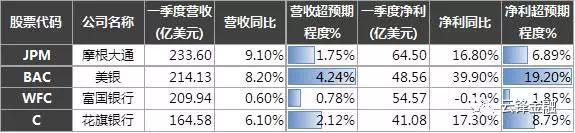 美国四大银行(JPM摩根大通、BAC美银、WFC富国、C花旗)占金融板块的40%,美股总市值的5%以上。而从业绩以及超预期程度来看,同样可圈可点。