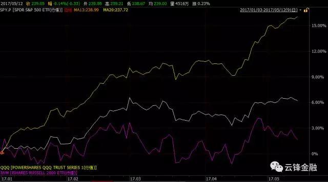 注:黄线代表纳斯达克100指数ETF,白线代表标普500指数ETF,紫线代表罗素2000指数ETF,数据截止至5月12日