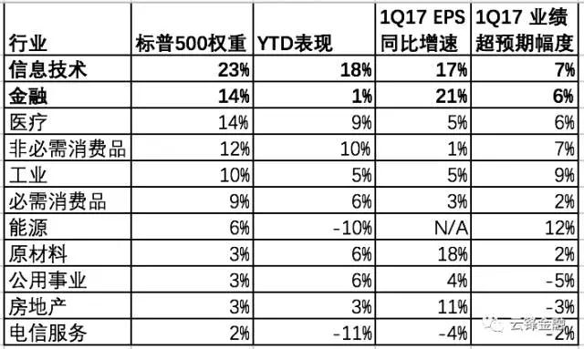 作为标普500中占比最大的两个板块,信息技术和金融的权重分别达到了23%和14%,且一季度的业绩都表现可圈可点。不仅同比增速达到双位数,而且将市场预期甩在了身后。