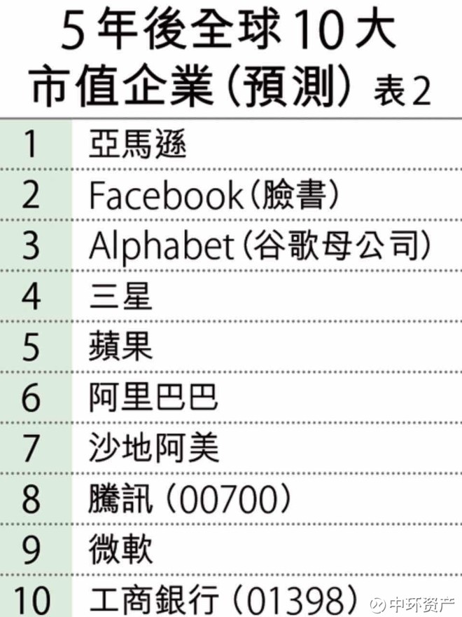 能源和银行业的龙头亦将有替换。沙特国家石油公司(沙特阿美)将取代埃克森美孚。沙特阿美计划上市,连国王都出马帮手推销,希望拿到2万亿元(美元,下同)的估值,募集1000亿元。但《金融时报》做过分析,认为合理估值只8000亿至1万亿元。如真是2万亿元,那么在IPO那一刻,应是全球市值最大。但若沙特阿美长期看好油价就不会IPO,电动车是玩真的,5年后能保住10大已算不错。