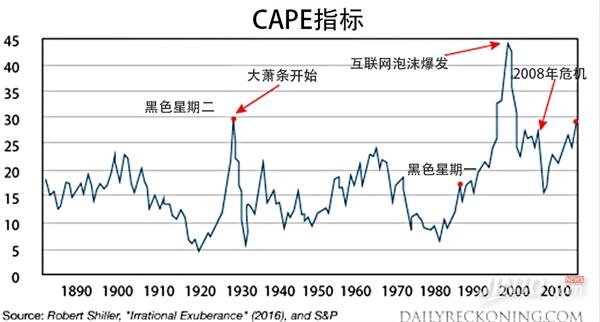 下图就是自1870年以来的CAPE指标走势图,可以看出,当指数走向高位时,经济往往有爆发危机的可能。而从图中可以直观地看到两件事:首先,现在的指标已经超过2008年危机时的水平;其次,指标已经接近1929年“大萧条”出现之前的水平。