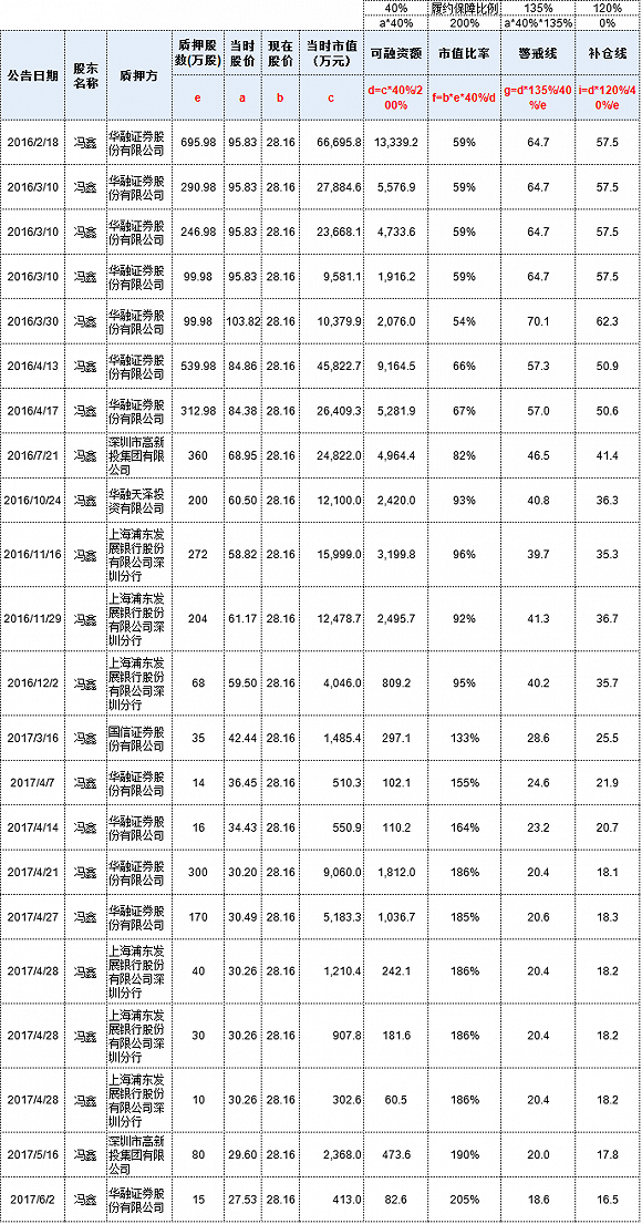 根据界面新闻翻阅公告后整理的数据发现,冯鑫主要的质押期是从2016年至今,根据公告披露的整理,如今尚有23笔质押尚未解质。而如果按照如下界面新闻的推算,冯鑫的部分质押早已面临需要补仓的情况。