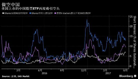 新浪美股 北京时间13日彭博报道,过去一个月的反弹推动中国多个股票指数攀上2015年触及的高点,然而美国的交易员们看空程度却进一步加大。以资产总额约61亿美元、跟踪中国股票的三家最大交易所交易基金(ETF)为例,它们的空单比例自3月触及低点以来就一直在持续攀升。
