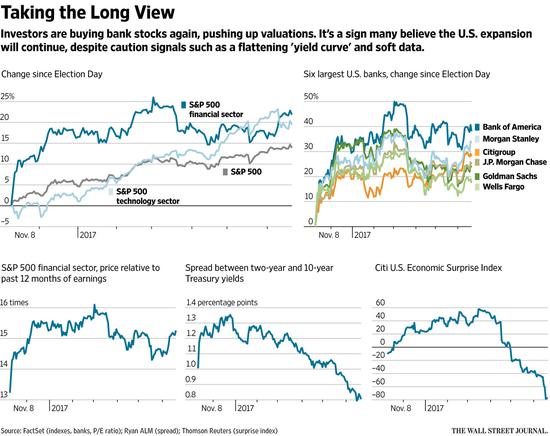 其他有望支撑金融类股的因素包括,有迹象表明,新一届美国政府希望放松金融监管。此外,虽然市场的低波动性会对银行交易业务构成挑战,但是一些分析人士称,市场的波动性有望回升。