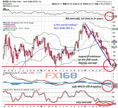 “唯一的一丝乐观希望是跌势终于触及200周均线关键支撑/阻力93附近,过去两年多其也是支撑水平,”Smith称。如下图所示,200周均线为红线。