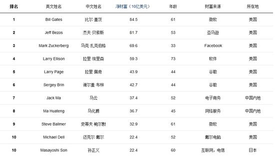 中国富豪方面,马云、马化腾分别以374亿美元、367亿美元的净财富位列榜单的第七和第八位,丁磊和李彦宏以161亿美元和158亿美元分别排在第十六和第十七位。