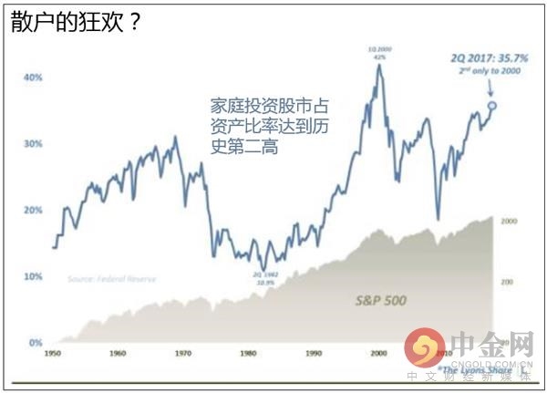 当前美股似乎正处于这个阶段。首先,上周用来衡量市场恐慌情绪的VIX指数空头持仓刷新了历史第二低位,说明当前市场极度乐观。其次,美国家庭资产用于股市投资的占比正在不断提高,目前已经接近35.7%,这是2000年互联网泡沫以来的最高比率,这意味着当前市场上可能充斥着大量的不理智的散户投资者。