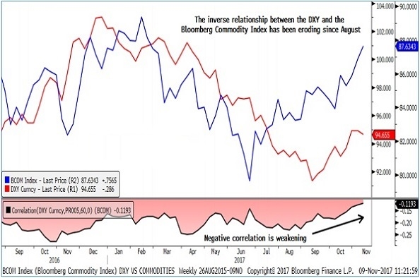此外,美元与大宗商品价格之间的负相关性也正在消失。环球外汇此前曾多次提到过,近期油价出现飙升,但美元却没有多少反应。