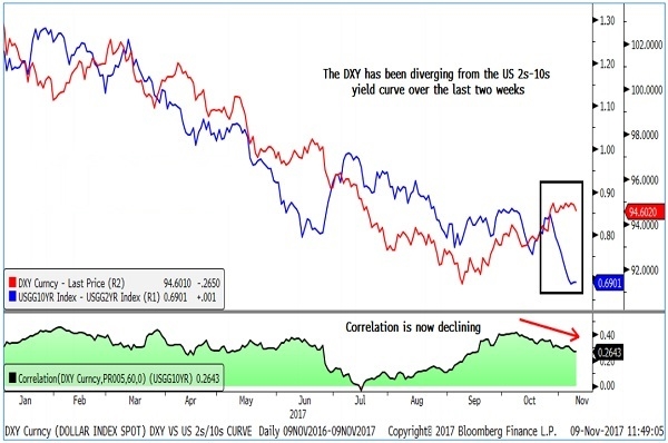 首先是美债收益率。在以往债市的息差变化往往决定着汇市的命运。然而当前美元指数和美债收益率曲线已经出现明显背离。目前两者的关联系数从0.4上方迅速下滑至了0.26.