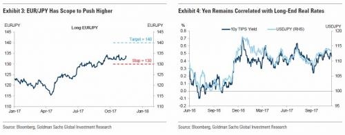 至于其他货币方面,高盛指出,欧洲国内和全球形势利好欧元/日元。高盛表示,欧元看上去被低估且持有量低。欧元区高于趋势的经济增长降低了政治风险。与此同时,日本央行将日元与全球债券收益率紧密联系在一起,预计一段时间内仍按兵不动。英镑方面,高盛表示脱欧进展方面仍将带来持续的下行风险。