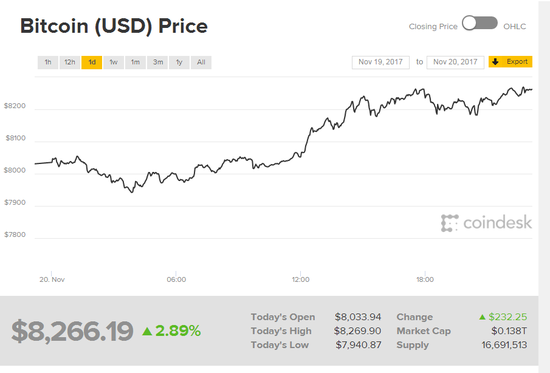 行业网站CoinDesk的数据显示,美东时间周一中午12点30分(北京时间周二凌晨0点30分)左右,比特币价格一度升至8263.62美元。截至美东时间周一下午7点14分(北京时间周二早间7点14分),比特币成交价为8266.19美元。