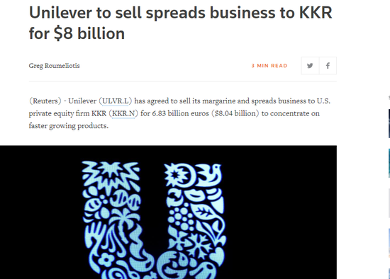 北京时间16日凌晨路透消息,联合利华已同意以68.3亿欧元(80.4亿美元)将人造黄油和涂抹酱业务出售给私募股权投资巨头KKR&Co.,从而专注于增长更快的食品和个人护理领域。