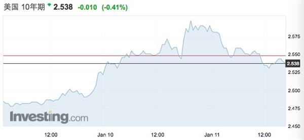 瞬间,美债遭遇“抛售”。格罗斯在美国时间1月9日在推特发布上述言论后,美国10年期国债收益率从2.487%附近最高暴涨至2.597%,涨幅逾100点。截至北京时间1月11日16:30,10年期美债收益率下幅回落至2.54%附近。早前,日本央行宣布削减部分长期限国债的购债规模,从某种程度上引发了格罗斯的判断,也推升了收益率。