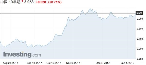 目前,中国10年期国债收益率在3.96%附近。不过,经历了2017年近0.8%的收益率飙升,各界预计2018年债市将趋于稳定。