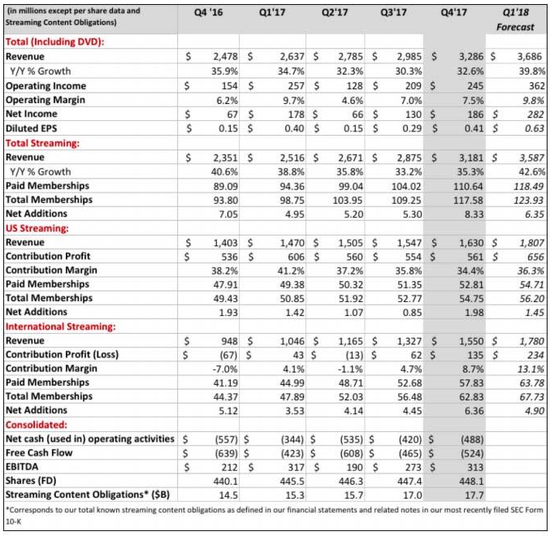 而在市场最为关心的订阅用户增长一块,财报显示,2017年Q4,Netflix全球流媒体用户为1.18亿人,净增流媒体用户833万人,高于上年同期的705万人,同时创下单季度增长新纪录。其中,美国地区净增用户为198万人,高于上年同期的193万人;国际范围内净增用户为636万人,高于上年同期的512万人。