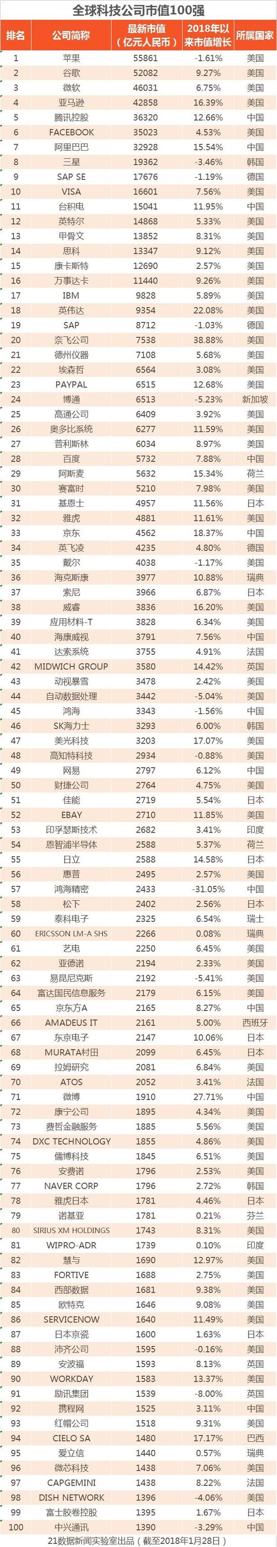 附:全球科技公司市值100强榜单↓↓↓