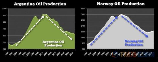 虽然说并非每个国家或者每个油田都会发生这样的情况,但是这样类似的现象却是发生过的。例如,在阿根廷和挪威就发生过。这点我们可以从下图中清晰的看出来。