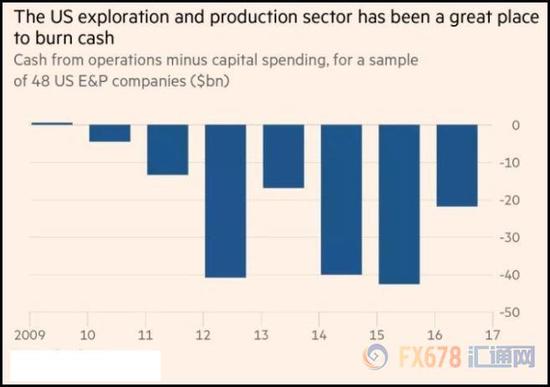 自2008年页岩油行业起步以来,美国页岩行业尚未因产油而赚到任何钱。不仅如此,他们还花了大量投资人的钱,债务还很重。下图显示,2009年-2017年,美国的能源勘探和生产企业的现金流为负值。