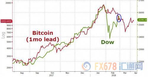 冈拉克的点睛之笔,“奇怪的是,我实际上在使用像比特币这类投机资产的情绪,作为市场未来走势的先行指标。”下图为比特币和道指走势: