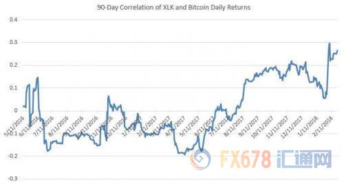 如今,从长期来看,由于市场的风险偏好,比特币和美股的联系日益紧密。下面两张图,一张显示标普500和比特币的90日相关性,另一张显示美国大盘科技股(使用XLK ETF)和加密货币的相关性。你会发现,比特币与美股之间的相关性比过去2年高。