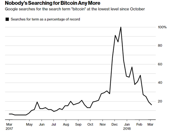 搜索引擎Google的最新搜索数据显示,如果将2017年12月的巅峰值设为100%,那么截至3月4日,比特币一词的谷歌搜索量已经跌至16%,创去年10月初以来新低。这一结果意味着,和去年12月的巅峰期搜索量相比,现在网民对比特币的搜索量减少了80%以上。此前比特币搜索量相仿的时间段,比特币价格在5000美元左右。
