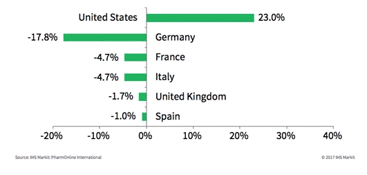 IHS Markit进一步对药品价格的变化趋势进行研究,时间跨度为药品发布之日至2017年1月。在研究的样本中,仅在美国观察到价格上涨现象,其余欧洲五国的样本药价均呈下降。其中德国拥有最大的降幅,达到17.8%,而对比美国,样本药价涨幅为23%。在法国和德国,很大一部分创新药物都受到降价的影响,法国有12例,德国有23例,而降价与这些药物加入该国的医保清单息息相关。