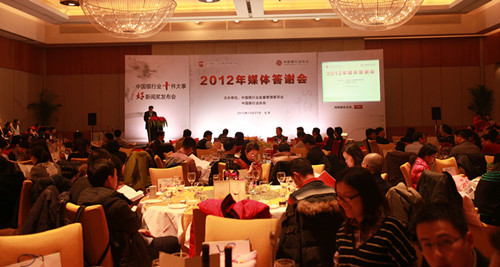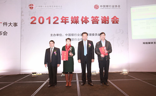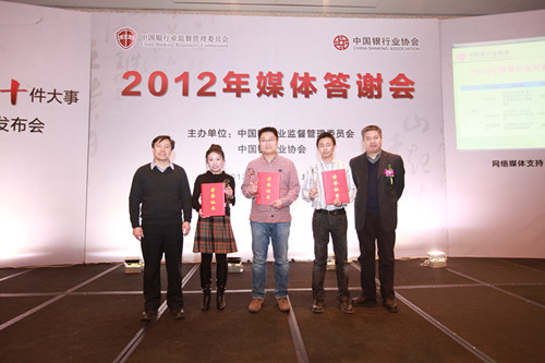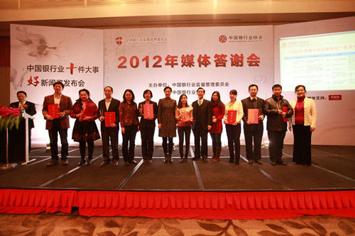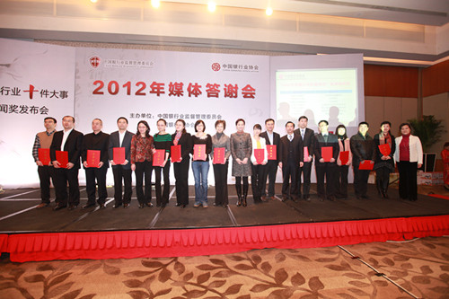2012年12月27日,由中国银监会和中国银行业协会共同举办的“2012年媒体答谢会暨中国银行业十件大事、好新闻奖发布会”在京召开。中国银监会阎庆民主席助理出席发布会并讲话。在京主流媒体财经记者及有关负责人、评审专家代表及主要银行业金融机构办公室及声誉风险管理相关负责人出席发布会。会上,中国银行业协会专职副会长杨再平正式发布“2012年中国银行业十件大事”,银行业协会副秘书长周永发宣读《关于对“2012年度银行业好新闻奖”评选组织工作进行表彰的决定》。发布会由中国银行业协会秘书长陈远年主持。
