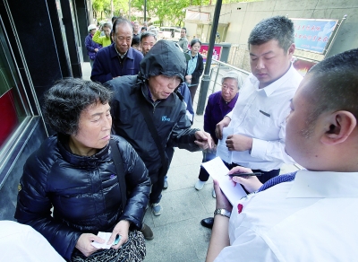 今早,不少大爷大妈穿着冬衣提前来排队。银行工作人员给他们发号 。摄/曹博远