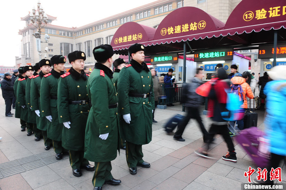 1月8日,2012年春运大幕开启。上午8时开始,北京站、北京西站开始实名制检票,旅客进站乘车须同时持车票和与票面所载身份信息相符的本人有效身份证件原件,票、证、人一致方可进站、乘车。实名制检票将从1月8日开始持续至1月21日结束。图为北京站的安保人员。中新社记者 李学仕 摄