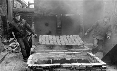 院子深处,两个约20厘米高的红砖台引人注目,台子的横截面和铁箅子类似,每个砖台上盖着两块木板,木板上都挖出两个洞,黑烟从洞眼儿往上蹿,砖台前有一个大号风扇,对准浓烟呼呼转动。