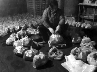 小辛庄村,一名女工用塑料袋分包熏干成品,作坊里每天生产未经卫生检查的熏干一千多斤。