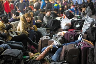 昨日,北京西站,大批旅客在候车室休息。当日,西站发送旅客21.9万人,达到今年春运以来旅客发送最高峰。本报记者 周岗峰 摄