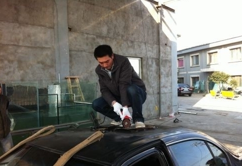 网友“裘正侃”发布的照片上,一名男子蹲在黑色轿车上准备切割车顶。