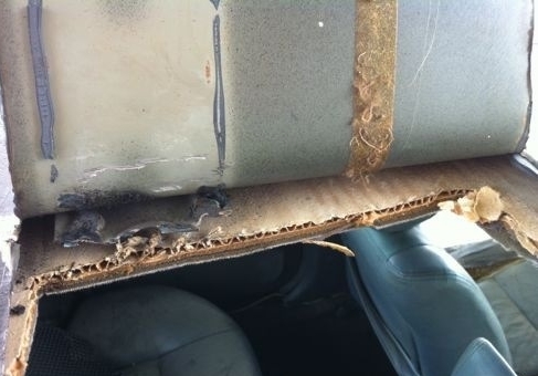 仔细观察图片不难发现,这厚厚的纸板还分为三层,上层是瓦楞纸,下面则是两层颜色不同、压实紧密的棕色纸板。在掀起的金属板上,还粘有纸板痕迹,显然这层纸板是被牢牢粘贴在车顶棚内的。