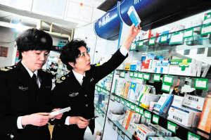 昨日,山东省食药监工作人员对药店胶囊药品进行检查。